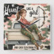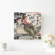 This fun square wall clock features a smiling female hunter in camouflage, confidently sitting on the tailgate of a white pickup truck, holding a bow and arrow. The playful text "Hunt Like a Girl AND Look Cute Doing It" adds a humourous and empowering touch to this unique piece.