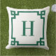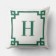 Decorative hunter green and white Greek key style square border with a modern serif monogram on an outdoor pillow.