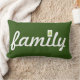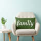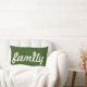 Green and white "family" typography pillow with a tree accent over the "i".