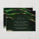This design features a dark green arch on a background of hunter green watercolor agate trimmed with gold faux foil. The word "details" appears in elegant white calligraphy script. Add your wedding information in white italics.