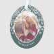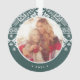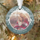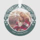 Festive Christmas photo ornament features a favourite photo on each side, encircled by a holiday sweater pattern in forest green and white. Personalise with your custom caption; shown with your family name and the year.