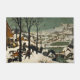 This design features an oil-on-wood painting by the 16th-century artist Pieter Bruegel the Elder (1525/1530–1569), who was one of the most significant artists of Dutch and Flemish Renaissance painting. It shows a scene of the winter season in which three hunters can be seen returning from an expedition accompanied by their dogs. The hunters have not been very successful and their dogs appear weary and tired. It is a scene of great pathos. However, one of the men is carrying the slender body of a dead fox. At a nearby inn, some adults and a child prepare food over an open fire. Birds such as crows and magpies are sitting in the bare trees; some critics have seen them symbolically as bad omens. The landscape is a flat-bottomed valley covered with white snow, and there is a river meandering through it; people are also playing hockey or ice skating on frozen lakes. There are wild mountain peaks in the background, despite the fact that such summits do not exist in the Low Countries of Belgium, the Netherlands and Luxembourg. The painting is sometimes also titled "The Return of the Hunters"; its original Dutch title is "Jagers in de sneeuw" [Hunters in the Snow]. The original work was completed in 1565, and it is now housed in the Kunsthistorisches Museum [Museum of Fine Arts], Vienna, Austria.