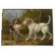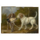 This design features a painting by the Italian artist Carlo Ademollo (1824–1911). It depicts two hunting dogs in the countryside of rural Italy. The fur of one of the dogs is white, while the other is brown. The brown dog is holding a live duck in its mouth, which it has caught while hunting for prey. The dogs are walking on a sandy patch of ground and there are tall grasses behind them. The sky is cloudy. The original artwork was painted by Carlo Ademollo in 1865.