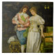 This design features a painting by the Italian artist Federico Andreotti (1847–1930). It shows an elegantly dressed couple after their wedding ceremony: after the joys of young love, they are settling in to the bliss of married life. The bride is wearing an elegant white costume, while her husband is wearing a blue-and-pink outfit. Both their costumes appear to be made out of silk and other fine fabrics. The lady is wearing a pearl necklace. The husband is smiling happily at his wife as he holds onto his arm. There is a pink rose on the floor, which may have been thrown during the ceremony.