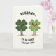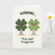 This card shows two smiling four-leaf clovers standing together on a creamy off-white background, their bodies shaded in two different greens—one deeper forest tone and the other a lighter fresh green. Their big eyes and rosy cheek circles face forward, and their wide grins sit close enough to feel like a shared inside joke between close partners 💚. Each clover has thin stick-like legs and tiny black feet, planted on a soft, muted peach strip that reads like a little ground line. The lighting is gentle and even, keeping the shapes and faces easy to see without heavy shadows. Above the pair, the word “HUSBAND...” is set in black, curved in an arch across the top area. Below them, “I’M SO LUCKY TO HAVE YOU.” appears in black as well, centered near the bottom, giving the scene a sweet St. Patrick’s Day focus ☘️. The two clovers stand side by side with matching blush and simple features, framed by the curved top word and the straight line of text beneath.