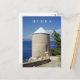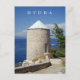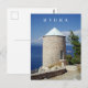 A beautiful view of a windmill on the island of Hydra in Greece printed on a postcard.