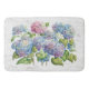 The lovely floral art on this bath mat features blooming hydrangeas in delightful shades from pink to blue to lavender, with a wood board texture background.