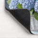 A white wicker basket filled with vibrant blue and purple hydrangeas rests on a surface with additional blossoms on table