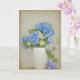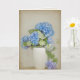 Purple and blue hydrangea flowers with Queen Anne's Lace in a vase with textured overlay.