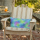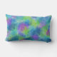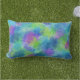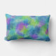 An abstract in shades of green, purple, lavender, blue and aqua grace this throw pillow.