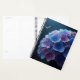 A vibrant purple and blue hydrangea with a bee stands out in stunning detail against a dark background.