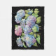 If you love hydrangeas, you'll certainly enjoy the lovely floral art on this blanket.  Blooming hydrangeas are shown in delightful shades from pink to blue to lavender.  Background is black but may be changed by customising.