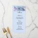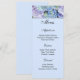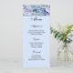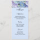 Menu Card is shown on basic white paper with a light blue background colour with a colourful hydrangeas print. Script and standard text in light Black.