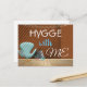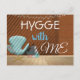 HYGGE with ME Cosy Zen Invitation Postcard . Hygge comes from the old Norse hyggja which is a content, comfortable, cosy state of mind. HYGGE with Me Typography on a blue and brown cosy room with a blue chair and blanket.