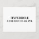 Why all the drama and exaggeration? It doesn't do anybody any good. It just makes people more emotional and problems harder to solve. Hold on, is it hyperbolic to say hyperbole is the root of all evil? Nevermind... just remember, hyperbole leads to drama, and drama complicates, confuses, and confounds. Spread the word, and stop the craziness.