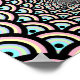 This is a captivating abstract image featuring a repetitive pattern of concentric, layered arch or scale-like shapes arranged to create an optical illusion of depth, pulling the viewer towards a central point. Each curved element is composed of bands of light blue, soft pink, and pale yellow, outlined in black. Small black dots are placed within the innermost coloured band of each shape unit. The pattern repeats outwards on a solid black background, creating a dizzying, tunnel-like effect. The overall style is graphic, geometric, and distinctly psychedelic, designed to be visually striking and somewhat disorienting. (designed by freepik)