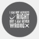 I Am Not Always Right But I Am Never Wrong, Funny Classic Round Sticker