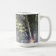 Inspirational mug with a printed photo image of beautiful sunlight shining in between pine trees.