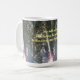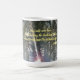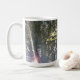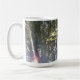 Inspirational mug with a printed photo image of beautiful sunlight shining in between pine trees.