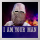 Closeup view of a helmet and an plate armour of a mediaeval knight against the colourful background which imitates the outer space or a battlefield to your liking. Text - I am your man - added