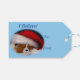 These are blue, Christmas gift tags featuring an original photograph of a Blenheim Cavalier King Charles Spaniel puppy sleeping in his Santa hat, with the text, "I Believe!".