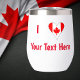 Personalised stemless wine tumbler with Canadian design to make your own statement. The funky looking flag of Canada is used instead of the word LOVE. You add your personalised text, in red letters, to tell the world what you love. Canada Day? Maple syrup? Mum? Dad? Quebec? Christmas? Your tumbler, your rules. You can create a special gift for someone special, too. Fun for family reunions, travel groups, and clubs, too. Cool housewarming gift.