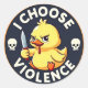 A quirky and humourous design featuring a cartoon-style yellow duckling with a small tuft of feathers on its head, glaring angrily with its mouth closed. The duckling holds a shiny knife with blood dripping from the blade, creating a striking mix of cuteness and menace. The design is encased in a circular emblem with a dark navy-blue background and a cream-coloured outer border. Bold white text reading "I CHOOSE VIOLENCE" adorns the border, accompanied by small skull icons on either side. The bold and minimalistic colour palette of yellow, navy blue, cream, red, and orange enhances the playful yet edgy vibe. Perfect for fans of dark humour and unconventional artwork.