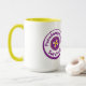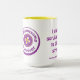 Coffee ringer mug with the slogan "I didn't survivor PMP to die of stress" on one side and the Pseudomyxoma Survivor button logo on the other.