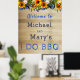 This rustic I DO BBQ engagement party welcome poster is perfect for welcoming guests to your engagement party BBQ. This fun barn wood-themed design features a light-coloured wood with a row of pretty boho sunflowers and blue feathers hanging from the top. Personalise with first names for a beautiful rustic flair. Other fonts and colours are available.