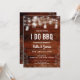 Trendy elegant invitation features mason jars, string lights, eucalyptus overlay over rustic wood grain background. Click to customise further to change font style or add more text to suit your needs.