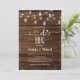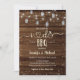 This elegant invitation features glowing string lights and mason jars with a rustic wood background.