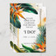 The Birds of Paradise Bliss Save the Date card invites your loved ones to mark their calendars for the momentous day when you say "I DO." The front of the card features a big and captivating caption that sets the tone, creating an air of anticipation. This bold announcement is set against the backdrop of the tropical allure of bird of paradise flowers, lush green leaves, and delicate straight lines, creating a visually stunning and harmonious ensemble.