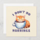 Embrace your morning grumpiness with this adorable greeting card featuring a cute orange cat and the witty phrase, 'I Don’t Do Mornings.' Perfect for cat lovers, coffee enthusiasts, and night owls, this playful design captures the essence of those who need coffee before taking on the day. A great gift for cat enthusiasts and grumpy morning personalities alike!