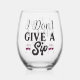 Embrace a carefree attitude with our "I Don't Give a Sip Stemless Wine Glass," the perfect companion for those evenings when you just want to unwind and enjoy your own company or laugh with friends. This glass boldly declares your laid-back vibe and sense of humour with the playful message, "I Don't Give a Sip," etched beautifully onto its surface, making it clear that you're all about enjoying the moment and the finer things in life, like a delicious glass of wine. Designed with a modern, stemless form, this wine glass marries style and practicality. Its ergonomic shape fits comfortably in your hand, allowing you to relax and savour each sip of your preferred red, white, or rosé without a care in the world. The durable, clear glass not only presents your wine in all its glory but also adds a touch of whimsy to your wine-drinking experience. Whether you're treating yourself to a quiet night in, hosting a casual get-together, or searching for the perfect gift for that wine-loving friend with a great sense of humour, the "I Don't Give a Sip Stemless Wine Glass" is a delightful choice. It's not just a wine glass; it's a lifestyle statement, reminding you to enjoy life's pleasures without sweating the small stuff. You can find more collections like this in my store "Bird's Eye".