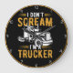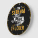 This wall clock features a humourous and assertive statement from a truck driver. Against a black background with a golden-yellow rim, it displays a white semi-truck graphic. The bold text "I DON'T SCREAM I'M A TRUCKER" is prominently displayed in a distressed golden-yellow and white font, making a witty declaration about the no-nonsense attitude often associated with professional drivers.