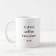 This fun mug will brighten your mornings! The phrase "I drink coffee, therefore a.m." is in brown comic-style lettering on both sides of the mug (choose other colours if desired). A great riff on René Descartes' famous phrase "I think, therefore I am." Makes a perfect gift for any occasion, friend, colleague, or loved one!