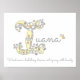Pretty I monogram art name poster perfect for a girls bedroom or playroom in shades of grey, white, yellow, pink and purple. Personalise with your child's own name beginning with I, and name meaning for a truly personalised unique gift for your child's bedroom or nursery, this example is for the name I Iuana wind over a bubbling stream, intriguing with beauty. Cute poster print ideal for a new baby, christening or baby shower gift. © Unique letter I monogram hearts and flowers drawing and graphic art design by Sarah Trett. www.sarahtrett.com for www.mylittleeden.com