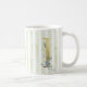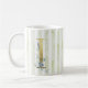Letter I, golden initial with blue watercolour foliage, on blue and white stripes, initial mug. © Julie McIver
