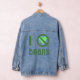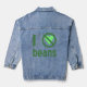 Women's denim jacket states "I hate beans." Design uses green letters, a green heart and the international "NO" sign to read , "I hate beans". For those that do not "heart" them. Humourous jacket makes a fun gift for any occasion.