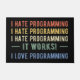 'I Hate Programming. It Works! I Love Programming' funny quote for programmers, tech enthusiasts, coders, and developers.