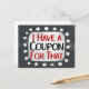 "I Have A Coupon For That" is a cute text design in grey with black and red text, along with a white accent shape and white textured whimsical dots surrounding it.