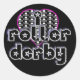 I heart roller derby in black and white (with a dusting of blue) star font on a hot pink and black skull and crossbones filled heart