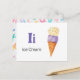 "Letter I is for Ice Cream" in our Alphabet Flash Card set. Get all 26 letters of the alphabet! A double-sided postcard that is great for memory games and teaching, geared for education, schools, teachers and homeschoolers for kindergarten and babies. All text is editable if you need to customise.