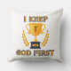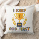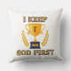 This throw pillow showcases a unique bold print font with golden coloured letters navy blue outline displaying the phrase “I Keep God First” with a 1st place trophy plus a floral theme on each side in the centre displaying the name God in this faith based bible theme. This pillow is made with high quality simplex knit fabric our pillows are soft and wrinkle-free the cover is machine washable.