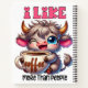 A funny, sarcastic, and colourful design showcases an adorable highland cow holding a steaming cup of coffee. The cow, with big blue eyes and a playful wink, has grey fur. Vibrant text reads, "I like coffee more than people." This charming design is available on various products, making it a perfect gift for coffee lover.