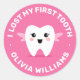 Stickers featuring a little tooth fairy on a hot pink background and the text "I lost my first tooth" and customisable name below.