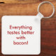 Breakfast lovers! Start your day with a sizzle and a smile with our Bacon Day key chain! I Love Bacon! Everything tastes better with bacon. Or customise with your text. For chefs, barbecue roasts and fun loving cooks. Celebrate National Bacon Day on December 30.