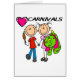 A stick figure boy with a corn dog and a stick figure girl with a big stuffed animal and text that reads "(heart) Carnivals" on I Love Carnivals T-shirts, mugs, tote bags, cards, stickers, and other cute stick figure items that you can customise with a name or other text.