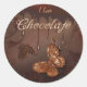 Yummy stickers features a rich melting edge of chocolate over a deep brown background of chocolate leaves and butterfly. Text says I Love Chocolate.