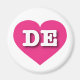 This magnet features a vibrant hot pink heart containing the bold, white, upper case letters DE, the official abbreviation for Delaware, the first state.